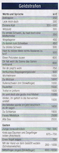 В свежем номере журнала ADAC (автомобильный клуб) нашла просто кладезь ругательств. С расценками. Оказывается, теперь установлены тарифы на ругательства и неприличные жесты, коими Вы в сердцах решите оповестить полицейских, что не согласны с их мнением по поводу Вашего стиля вождения. По-моему, этот “прайс-лист” можно еще и справедливо назвать пособием по грубым выражениям. Наслаждайтесь: